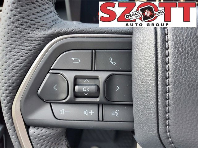 - Leather-wrapped manual tilt/telescopic steering wheel with phone, audio, display/infotainment, and driver assist controls.
