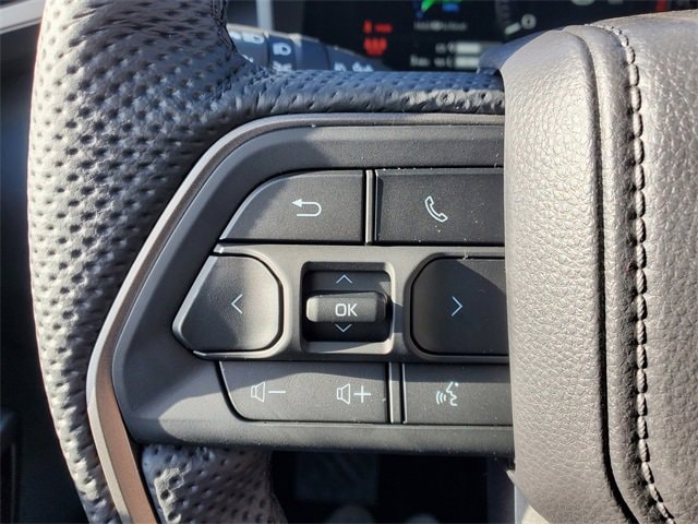 - Leather-wrapped manual tilt/telescopic steering wheel with phone, audio, display/infotainment, and driver assist controls.
